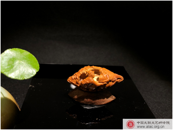 在创作过程中,由于橄榄核的特殊形状,设计布局受限。为了使画面更具有观赏性、艺术性,通过对橄榄核结构的考虑,我大胆尝试打破核的外形,突破传统核雕的外表雕刻技法,在橄榄核内部进行雕刻,内外相结合的雕刻手法使整体效果更加立体、通透。