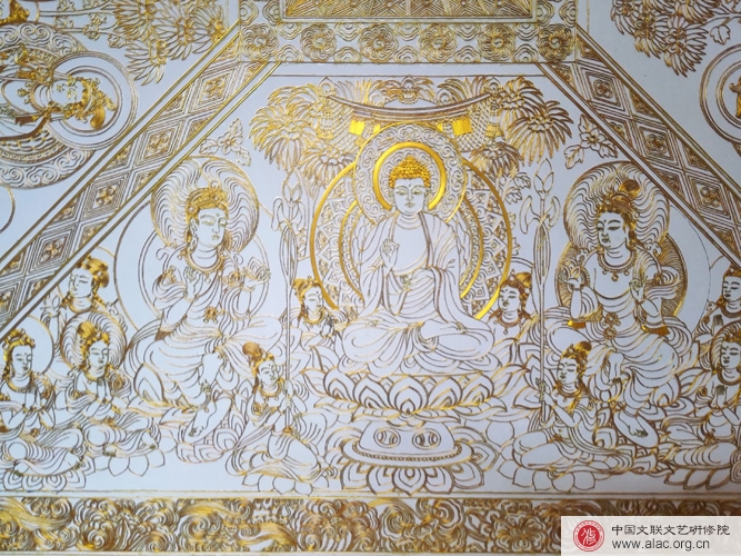 本次项目创作,我选定了六幅“藻井”范本,根据珐琅壁画的艺术特性,先通过临摹,再加上个人白描、细描仔细刻画,精益求精,让金丝融入到线条中,赋予缕缕金丝以生命和灵魂。