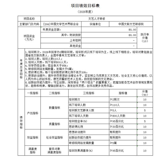 预算绩效管理情况说明:2026年对中国文联文艺研修院项目支出全面实施绩效目标管理,二级项目1个,为文艺人才研修项目,共涉及一般公共预算资金80万元。