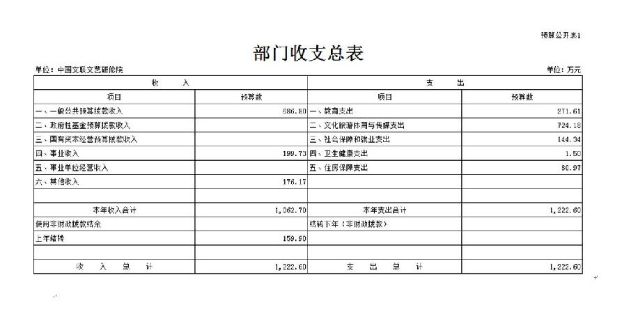 按照综合预算的原则,中国文联文艺研修院所有收入和支出均纳入部门预算管理。收入包括:一般公共预算拨款收入、事业收入、其他收入、上年结转;支出包括:教育支出、文化旅游体育与传媒支出、社会保障和就业支出、卫生健康支出、住房保障支出等。中国文联文艺研修院2026年收支总预算1222.6万元。 二、收入预算情况说明