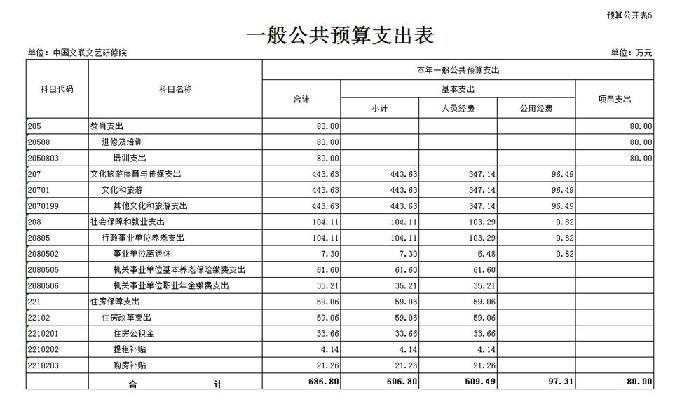 中国文联文艺研修院2026年财政拨款收支总预算725.09万元。收入全部为一般公共预算拨款,包括:一般公共预算拨款本年收入686.8万元、一般公共预算拨款上年结转38.29万元;支出包括:教育支出80万元、文化旅游体育与传媒支出445.51万元、社会保障和就业支出140.52万元、住房保障支出59.06万元。