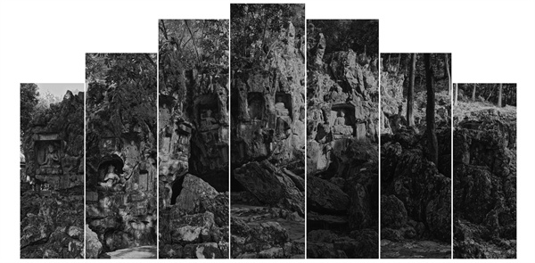 在杭州居游十五载,飞来峰的山石、造像与摩崖题刻,早已不是单纯的风景,而是我与传统文化对话的精神场域。这里的冷泉溪潺潺流淌,造像与山体浑然共生,题刻间沉淀着唐、宋、元以来的文脉印记——每一处细节,都承载着山水与人文的层叠共生之道。多年来,我以摄影为创作媒介,在传统书画与数字拼贴技术的碰撞中探索,试图让摩崖石刻跨越时间与空间的界限,走出幽谷密林,走进更多观众的视野。