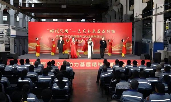 经典歌曲联唱《踏歌起舞》《不忘初心》一开口,欢快旋律便裹着车间里的烟火气漫开,瞬间点燃职工们的热情;竹笛独奏《秦川抒怀》的悠扬乐声,与远处隐约的机器运转声交织,勾勒出关中大地的质朴风情;秦腔武戏《火流星》的演员在车间腾挪翻转,高难度技艺引得职工们踮脚观看、阵阵喝彩;京东大鼓《送女上大学》、相声《疯狂陕西话》用接地气的方言和故事,把生活温情说进职工心里;柔美雅致的舞蹈《只此青绿》,在工业风的车间里绽放别样韵味,让传统文化与基层生产场景撞出奇妙火花。