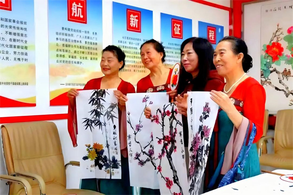 丹青绘岁月,画里画外都是爱。在美术桌上,每一幅画都是志愿者与社区老人的心灵对话。志愿者刘秀华听65岁的李波奶奶说“我从小喜欢菊花”,便勾勒出金黄可人的秋菊。姜芳菲得知朱桂峰爷爷喜爱竹子,便将竹与菊同画一纸——竹之挺拔比喻君子风骨,菊之傲霜呼应重阳习俗,二者相互映衬。刘秀华又精心画出牡丹、兰花与菊花,表达了希望老人身体健康、生活富足的美好心愿。李永辉专注绘制画作《寒梅》,淡墨画枝、浓墨点蕊,梅花傲骨,恰如长辈历经风雨仍坚韧乐观的生命姿态。当65岁的刘桂荣奶奶看到为她绘制的牡丹时,激动不已:“我就喜欢牡丹!”现场色彩与笑容交织,成为一抹动人的风景。