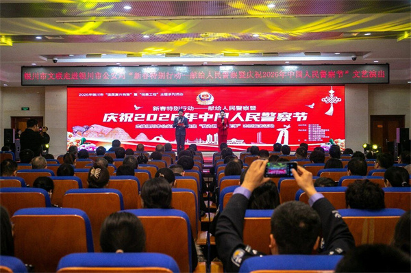 来自银川艺术剧院、银川市朗诵艺术家协会的20余位艺术家,向银川市公安系统的200余名基层民警,献上了一场集歌曲演唱、器乐演奏、配乐朗诵、快板、相声、杂技等不同艺术形式的精彩演出,赢得了观众的阵阵掌声,受到大家的热烈喜爱。