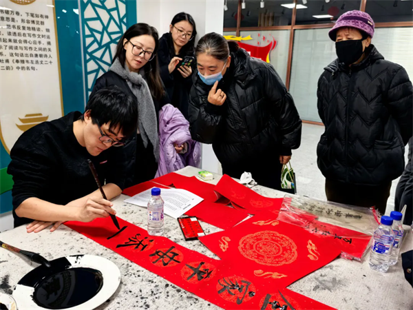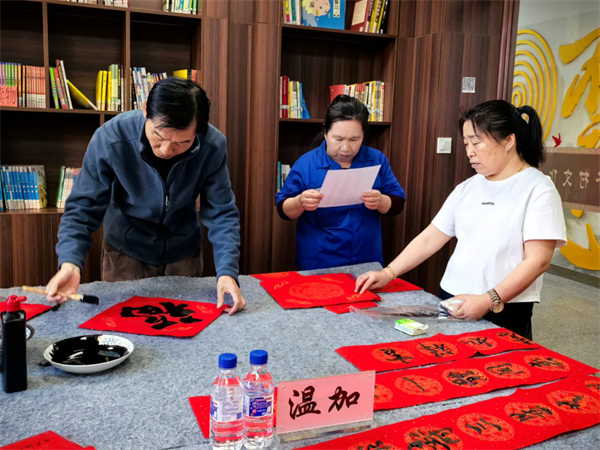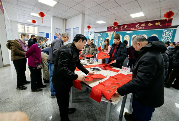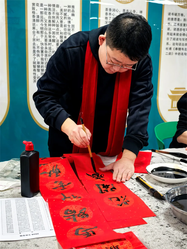 活动现场,红纸铺展,墨香四溢,处处充盈着热烈喜庆的节日气氛。志愿者精神饱满,倾情创作。一副副饱含深情、笔力遒劲的春联,或描绘乡村振兴的喜人图景,或书写阖家团圆的幸福期盼,还巧妙融入了“产业兴旺”“乡风文明”等乡村发展愿景,承载着辞旧迎新、纳福迎祥的美好祝愿,赢得现场村民们的掌声与称赞。