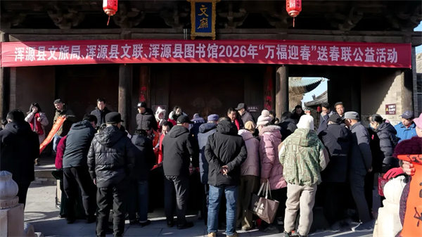 浑源县文联、文旅局、图书馆联合在省级文物保护单位浑源文庙举办“墨香暖古城·万福进万家”2026年“万福迎春”送春联公益活动。文庙殿前广场红纸铺展、墨香萦绕,书法爱好者挥毫泼墨,一行行俊逸书法、一句句真挚祝福,寄托着市民对新年的美好憧憬。此次活动将文物保护利用与传统节庆民俗深度融合,让群众在浓浓墨香中感受中华优秀传统文化魅力,切实增强文化获得感与幸福感。