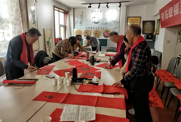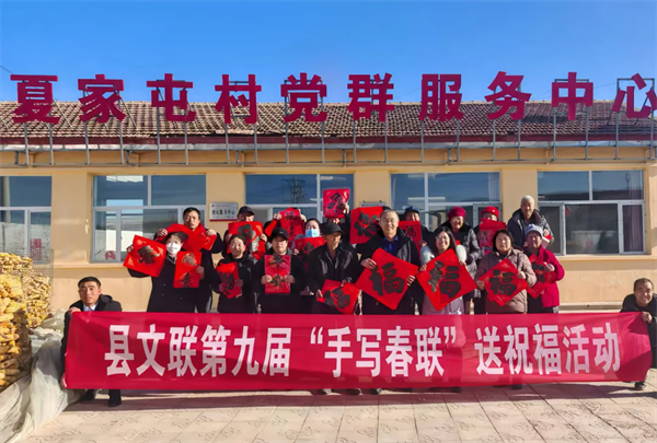 天镇县文联组织书法爱好者开展第九届手写春联送祝福文艺惠民活动,先后走进夏家屯村、三十里铺村及昊泰农业生物科技有限公司,为基层群众现场手写春联、赠送“福”字。活动现场,书法爱好者笔力遒劲,在红纸上书写吉祥寓意与美好祝愿。活动既弘扬了中华优秀传统文化,又将新春的温暖与年味送到群众身边,传递了浓浓的节日温情。