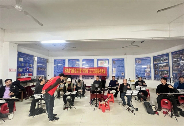 在田林县文化馆,百色市曲协副主席黄敏手把手指导群众排练壮族八仙鼓,为大家细致讲解节奏把控和动作编排;马骨胡志愿者周祖练则围绕马骨胡演奏技巧、曲目演绎开展志愿辅导,让传统文艺在基层焕发新生。