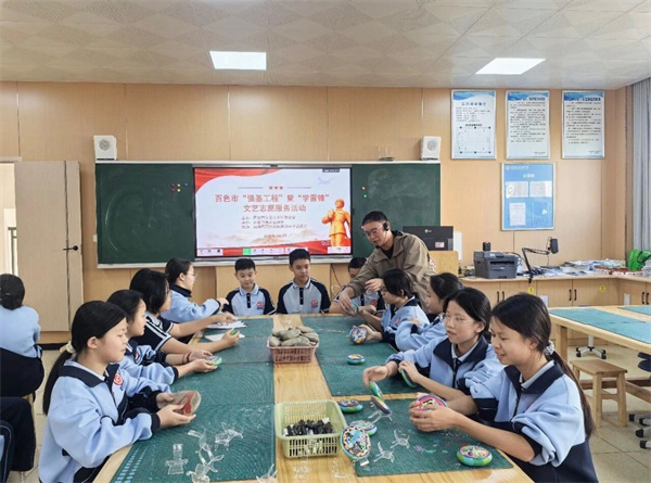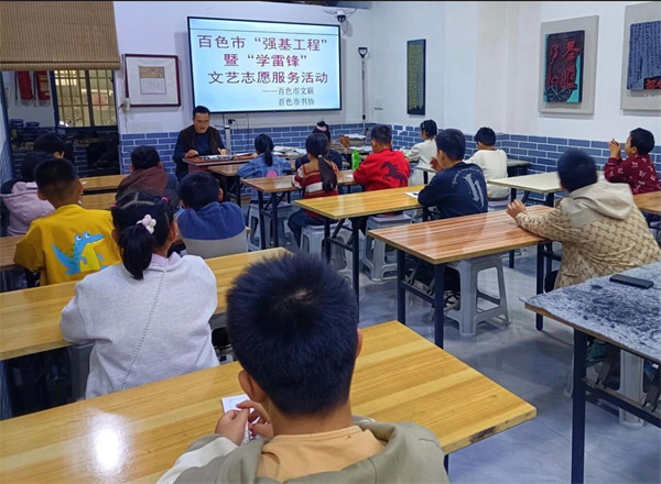 在校园一线,文艺志愿者深耕美育。百色市书协主席团成员苏刚、杨秀川、张配配等走进校园,为学生开展书法辅导,从执笔姿势到章法布局均耐心指导,一笔一画传递书法之美;百色民族高中教师、美术志愿者龚国臻指导学生以石为纸、以彩为墨,进行石头彩绘创作,点亮青少年艺术梦想。
