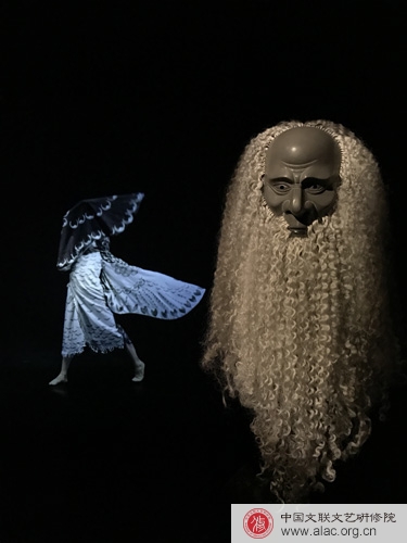 日本协会正在展出的,是2005年获得透纳奖的英国艺术家的Simon Starling(西蒙·斯塔灵)的戏剧装置作品At Twilight (《黄昏》)。这个展览计划筹备日久,是艺术家通过自己的研究,以视觉的形式复现、重新演绎了英国著名诗人W.B Yeats(威廉·巴特勒·叶芝)在1913年至1916年间创作的日本能剧《井边的鹰》。为了完整呈现这部令当时英国文化界轰动的日本戏剧,Simon Starling重新制作了服装和道具,并召集了戏剧艺术家重新排演,并通过影像和装置的形式在日本协会的展厅中展出。同时,展厅中在第三篇文献部分展示了杉本博司收藏的众多日本能剧面具、MoMA收藏的布朗库西的雕塑,以及当时的出版物和相关照片文献,以及日本传统戏剧艺术的绘画文献等等,尤其是艺术家制作的带有头脑风暴式的视觉逻辑和思想逻辑关系图,使观众对整个展览的结构有了更为清晰的认识和理解。