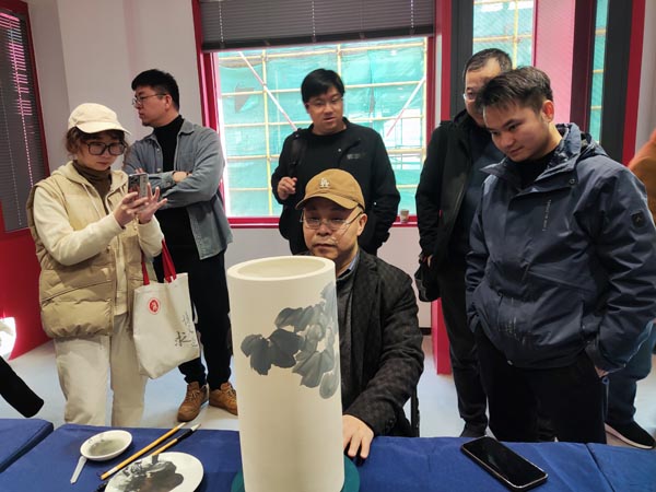 笔会交流环节,两地艺术家进行深入的艺术创作交流,活动现场氛围浓厚、精彩纷呈。景德镇市书法家、美术家在紫砂素坯上点画勾描,为紫砂增添一抹灵动,无锡二期的学员们则初步尝试在陶胚瓷板和瓷瓶上进行创作,挥毫泼墨间对不同的材质有了更为细腻的感触。两地艺术家共同创作了20余件作品。
