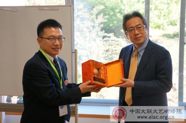 研修班班长、中国文联文艺评论中心副主任周由强(左)向吉田智誉树赠送礼物